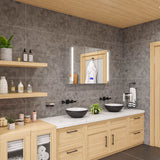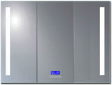 This state of the art Alfi brand triple door Medicine Cabinet has built-in Bluetooth and speakers so you can listen to your favorite symphony while getting ready. A digital clock and room temperature are shown on the screen. The defogger function ensures that your mirror won't fog up no matter how long your shower. The cabinet includes four height-adjustable 1/4" thick tempered glass shelves that are 3-1/8" deep, as well as an electrical outlet for two standard plugs and 2 USB plugs. The cabinet is made of high-quality aluminum, covered with mirrors inside and out, and includes wall mounting hardware for easy installation. It is hardwired to connect directly to the electrical system and has an energy-efficient 6,000k LED lighting coming from both sides at 6,000k. That's very white. The cabinet features a single left-swinging door and two right-swinging doors with mirrors on both sides and with soft self-closing door hinges by the top-quality DTC brand. Its UL-approved electrical components ensure safety, and it meets the IP44 waterproof standard. The defogger and the light turn on/off together on the same infrared switch, so if the light is on, the defogger will be on as well.