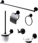 Matte Black. Everything you need is included: Towel Bar, Soap Dish, Towel Ring, Covered TP Holder, Robe/Towel Hook, Toilet Brush Set