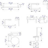 - For complete dimensions of each piece, check the dimensions shown in the dimension image. Note that the Toilet Brush Set and Soap Dish are intended for wall mounting.