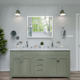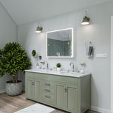 Lighting color is measured in degrees Kelvin. Running through the spectrum, the higher the Kelvin temperature, the closer to pure white light. The light on bright sunny day with blue sky measures 5,600° Kelvin. A very bright day with a cloud-covered sky weighs in at 6,000° Kelvin. An incandescent (regular) bulb gives off light at approximately 3,200° Kelvin. This is quite yellow, as evidenced by photographs taken by lamp-light. But our eyes are used to the color and in most circumstances it looks normal if not pleasing. By contrast, most fluorescent lighting is a color called "cool white" used because it is the cheapest color to produce. Cool-white is 4,600° Kelvin and definitely green. Any photo taken under cool-whites looks green to the viewer. A color-corrected fluorescent used in our mirrors usually run between 5,000° and 5,400° Kelvin, and approximates blue-sky daylight. The closer to daylight color the more expensive the bulb.