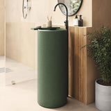 Custom made from concrete each Konkretus UBUD 06 Pedestal Sink is carefully hand-crafted in Colombia. The concrete itself is infused with color that can never wear or rub off. There are thirteen fashion colors for your selection. The removable accessory tray is included. Pre-drilled for single-hole faucet. With overflow. Shipment in 5-6 weeks. It stands 35.4" tall and is 14.6" x 15.7" across at the top, very slightly oval shaped. Having originated in Colombia, Konkretus maintains a passion for design and the immense potential of concrete to be crafted into exceptional pieces. They have altered the perception of concrete in the realms of architecture and design. The belief lies in the prospect of creating timeless and meaningful pieces for both the home and the city, where simplicity and emotional connection with individuals are the essential elements of good design. The power of wonder is truly valued, and the journey is enjoyed with every accomplishment, variation, and remembrance that simplicity is always the better option. Good design is the ultimate tool in transforming the world. The goal is to accompany people while they create cherished memories by crafting beautiful, timeless pieces.