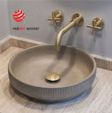 - Winner of the Prestegious Red Dot Design Award for 2022, the Konkretus LOTUS 01 concrete bathroom vessel sinks are hand made in Columbia.