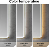- Touch-sensor on the mirror face uses long-press for dimming anywhere from very bright 3,300 Lumens at 100%, down to 10%, quick-presses for color changes.