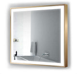 - Krugg Recangular Gold Framed LED Vanity Mirror in 4 sizes with E-Z On/Off Touch Sensor Dimmer and built-in Defogger using safe, gentle heating coils.