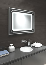 Backlit in the center section, the Halo mirror from Aamsco has an outer frame of glass set in aluminum. Within the aluminum frame lies glass with decorative black and silver rings, framing the innermost section which is the backlit mirror. It's a dramatic knock-out! The LEDs are rated at 30,000 hours, and have a color temperature of 2,600k - 2,800k, Warm White, with a Color Rendering Index (CRI) of 90+. The mirror conforms to ADA guidelines and is suitable for damp locations such as the bathroom, with an IP55 Rating (see IP55 Explained). It is also ETL listed. The light output is at 1395 Lumens with a tiny electrical consumption of only 22 Watts. This is a hardwired mirror and requires an on-off switch. It is non-dimmable.