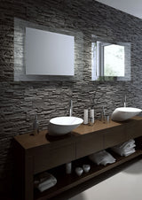 Bands of matte glass grace the left and right margins of the architecturally curved glass into which a 27.55" Wide x 21.65" mirror is set. Overall dimensions are 35.58" Wide x 27.55" High x 3.54" Depth, from the rear center to the extremes of the curved glass. Mild LED lighting at 480 Lumens from behind the mirror illuminates the room with a glowing effect The LEDs are rated at 30,000 hours, and have a color temperature of 2,600k - 2,800k, Warm White, with a Color Rendering Index (CRI) of 90+. The mirror conforms to ADA guidelines and is suitable for damp locations such as the bathroom. It is also ETL listed. The mirror consumes only 8 Watts of electricity - truly tiny. This is a hardwired mirror and requires an on-off switch. It is non-dimmable.