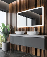 Electric Mirror's Eyla LED bathroom mirror is brightly front-lit via slim rounded-end diffused surround, providing forward-facing task lighting and a subdued and ambient room glow. OmegaMirror corrosion-resistant lead-free-, copper-free glass is used for exceptional durability. LED front-facing illumination is at 3,000k with a CRI of 90+. Optionally available with Keen dimming technology. 7-year Limited Warranty.