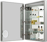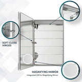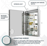Aquadom's Edge Royale 1-Door Medicine Cabinets can be recessed or surface-mounted - with recess and surface mounting hardware included. A frosted perimeter around the door-front mirror sends out 6,500k (daylight) LED lighting at 810 Lumens with a CRI of 80+. The soft-close hinges open to 155 degrees. Inside the cabinet there are adjustable 8mm thick glass shelves. Open the door - the infra-red sensor actives the interior lighting, and you'll find an LED-lighted 3x magnifying mirror that flips out and is vertically adjustable for easy viewing - and it's detachable. Also inside, there's a double electrical outlet. The door is mirrored inside and outside as is the back wall, and the mirrors are high quality polished-edge 5mm pure silver backed, for the best reflectivity. Lighting is controlled by a touch sensor on the door face what has On/Off/Dimmer functions. Short press for On/Off, and long press for dimmer functions. There's also a built-in defogger for keeping your cabinet mirror clear after a shower. More than you'd expect in a Medicine Cabinet.
