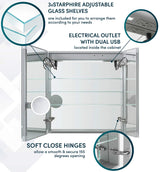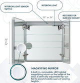 Aquadom's Signature Royale Medicine Cabinets have frosted vertical bands in the mirrored doors that emit LED lighting at 810 Lumens with a CRI of 80+. The LED color is adjustable in steps from Warm (3,000k) to Neutral (4,500k) to Daylight (6,500k). At 4,500k the LEDs emit 1,620 Lumens - twice as bright. The soft-close hinges open to 155 degrees. Inside the cabinet there are adjustable 8mm thick glass shelves. Open the door to find an LED-lighted 3x magnifying mirror that flips out and is vertically adjustable for easy viewing - and it's detachable. Also inside, there's a double electrical outlet and two USB ports. The door is mirrored inside and outside as is the back wall, and the mirrors are high quality polished-edge 5mm pure silver backed, for the best reflectivity. Lighting is controlled by a touch sensor on the door face what has On/Off/Dimmer functions. Short press for On/Off, and long press for dimmer functions. Another button steps through the three LED color settings. Also on the door face is a convenient digital clock. There's a built-in defogger for keeping your cabinet mirror clear after a shower. Interior lighting is activated automatically when the door is opened. Mounting hardware and side panels for recessed or surface mounting is included. You won't find more features, anywhere, in an LED medicine cabinet.