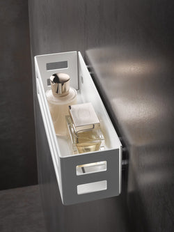 Keuco's "protected" shower basket is made from rustproof solid aluminum, finished in Matte White. Protected from what? Because as a shower shelf, it's surrounded by a "fence" it protects your toiletries from slipping to the shower floor. The shelf has integrated drain slots, and is removable for cleaning or other purposes. The sleek lines and superb quality of a Keuco product will pamper you and captivate you with its flawless finish, careful craftsmanship, and hidden mounting arrangements. OPEN BOX - Inspected and Certified New.