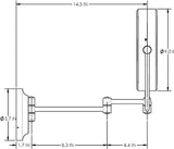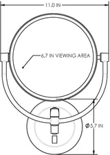 - Dimensions: 6.5" Diameter viewing area in 9" Diameter x 2.2" frame. Base: 5.75" diameter x 1.88" Deep with switch. Retracted Size: 14" High x 12" Wide x 3.25" Deep. 6.83 lbs. Offset height from center of the mirror to center of mounting plate: 6". Maximum extension from wall: 15.25"
