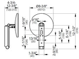 - Perfect positioning can be achieved simply with the mere motion of the hand by adjusting the articulating arm and pivot. Mirror diameter: 8-3/8". Mounting plate: 7-1/8" x 1-3/4" with rocker switch on top. Retracted, the distance from the wall to the face of the mirror is 4-7/16" and extended, 12".