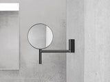 The Keuco Plan Series wall-mounted makeup mirror in Matte Black, matches the numerous other Black Collection and Plan series bathroom hardware. Magnification power is 5x, and reversible to 1x. The mirror diameter is a relatively large 7.63", plus there's a handle beneath the mirror for manipulation of the mirror in three dimensions, without leaving fingerprint smudges on the glass.
