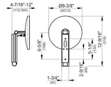 - Perfect positioning can be achieved simply with the mere motion of the hand by adjusting the articulating arm and pivot. Mirror diameter: 8-3/8". Mounting plate: 7-1/8" x 1-3/4". Retracted, the distance from the wall to the face of the mirror is 4-7/16" and extended, 12".