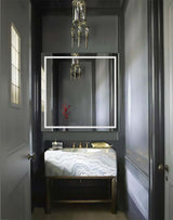 This lighted bathroom mirror is a true ICON of sleek, aesthetic style and sophistication. The highest quality silver-backed, copper-free glass provides you with a clear, crisp, and flawless reflection. Truly functional art, this LED front-lit mirror provides task-specific dimmable daylight illumination for your cosmetic, hygiene and dressing needs. Experience true luxury with the built-in defogger mechanism that maintains a fog-free mirror every time.