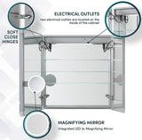 Aquadom's Edge Royale 2-Door Medicine Cabinets can be recessed or surface-mounted - with recess and surface mounting hardware included. A frosted perimeter around the door-front mirror sends out 6,500k (daylight) LED lighting with a CRI of 80+. The BLUM soft-close hinges open to 155 degrees. Inside the cabinet there are adjustable 8mm thick glass shelves. Open a door - the infra-red sensor actives the interior lighting, and you'll find an LED-lighted 3x magnifying mirror that flips out and is vertically adjustable for easy viewing - and it's detachable. Also inside, there's a double electrical outlet. The doors are mirrored inside and outside as is the back wall, and the mirrors are high quality polished-edge 5mm pure silver backed, for the best reflectivity and clarity. Lighting is controlled by a touch sensor on the door face what has On/Off/Dimmer functions. Short press for On/Off, and long press for dimmer functions. There's also a built-in defogger for keeping your cabinet mirror clear after a shower. More than you'd expect in a Medicine Cabinet.