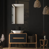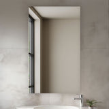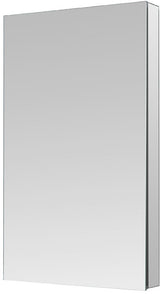 - The frame is sleek anodized aluminum, The door opens and closes via the concealed finger-pull door edge - no fingerprints on the mirrors.