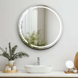 - Altair Radiant Round Frameless Mirrored Medicine Cabinet with LED lighting around the perimeter of the door on the exterior side and similar perimeter lighting on the inside of the door.