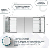 Aquadom's Royale 4-Door Medicine Cabinet, 72" Wide x 36" High. Recessed or surface-mount - with surface mounting hardware included. Each door is 18" wide with soft-close hinges that open to 155 degrees. Inside the cabinet there are adjustable 8mm thick glass shelves. Open the door to find an LED-lighted 3x magnifying mirror that flips out and is vertically adjustable for easy viewing - and it's detachable. Also inside, there's a double electrical outlet and near it, a magnetic bar to hold your small metal items. The door is mirrored inside and outside as is the back wall, and the mirrors are high quality polished-edge 5mm pure silver backed, for the best reflectivity. Perfect for a "His & Hers" dual sink arrangement, while making a luxurious statement over the vanity in your bathroom.