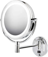 - Polished chrome or stain nickel finish. Extends up to 12.5" from the wall on its extension arm. Mirror diameter 9.5" including the Chrome rim.