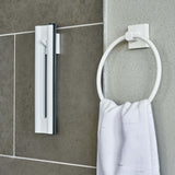 Keep your glass shower enclosure and your shower walls clean with this squeegee in the SIDELINE collection from SMEDBO. It's 9-1/2" wide - a convenient size. The way it's constructed, the hand-grip slot enables hanging on a hook (included) - so you needn't have it waiting on the shower floor. The blade itself is pure durable black silicone. There are two finishes - Polished White or Matte Black.