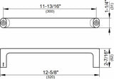 - Dimensions are 12-5/8" overall length and it mounts on 11=13/16" centers. The bar is 1-1/4" thick.