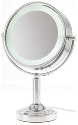 The 15x side flips over to 1x regular view, and the LED lighting illuminates both the 1x and the 15x sides of the mirror. For the most critical work the 15x magnification can't be beat! This is a plug-in mirror standing 14.75" high on a weighted/padded base. The mirror section is 8.5" in diameter with a 6.25" viewing area. Finished in Polished Chrome.