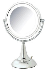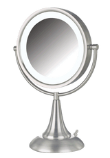 - Free standing reversible vanity mirror with 8x/1x magnification.