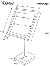 Whitehaus Collection's Free-Standing Square Mirror with LED lighting and 5x magnification offers you a sleek and modern look, while providing close-up magnification. Perfect for a bath or dressing room, this versatile mirror has all the features you need to look your best. An on/off flip switch on the base will activate the LED lighting around the perimeter of the mirror when you need it and the 5x magnification mirror pivots so you can be sure every detail is in place. This high quality square vanity mirror easily moves to any room and fits onto any counter. Available in your choice of either polished chrome or brushed nickel.