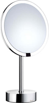 Smedbo of Sweden makes this free-standing makeup mirror. The mirror is LED lighted and operated by an automatic sensor - waive your hand within about 5-1/2 inches and the sensor illuminates the LEDs. After 12 seconds of no movement, the LEDs are turned off automatically. The stand is solid brass, finished in polished chrome, and the (glass) 7x magnification mirror section sets inside a high-quality acrylic frame. Overall height: 15-inches". The mirror diameter is 8.5-inches and the base is 4.7-inches in diameter.