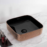 Whitehaus Collection exceeds expectations with the exquisite additions offered in the Isabella Plus Collection. This sink has a smooth black interior and an embossed Rose Gold Exterior. Combining both beauty and durability, these above mount sinks are crafted from the highest quality vitreous china available. The fine craftsmanship shines through with their luxurious, unique, and bold seamless design. These rectangular above-mount bathroom sinks feature embossed exteriors, and smooth solid interior in black or white. There's a center drain hole and no overflow. Let a Whitehaus Collection help redefine your home with a new level of sophistication by enhancing your bathroom decor with an elegant Isabella Plus above mount basin.