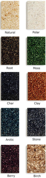 - 11 Colors gloss-finished. Natural materials are sued and colors may vary slightly. Chip sizes: Natural Birch - 6mm, all others 2mm. Refer to color chart.