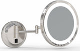 The 944-2 Series 5x Hardwired LED Round wall-mounted makeup mirror gives you a flawless image. The 3-position switch changes as follows: 3,500k - Off - 5,600k. The 3,500k temperature setting produces light very, very similar to regular light bulbs, while the 5,500k temperature setting produces light very similar to blue-sky white daylight. Both color temperatures are equally as bright at 475 Lumens. The silver-backed mirror lens has 5x magnification and the mirror can extend up to 12.8" from the wall - more than adequate to give you a close-up view over even 24" vanity tops (and most vanities are 18" deep). The mirror pivots at the elbow, pivots on axis and tilts up and down for the perfect view. Finished in Polished Nickel.